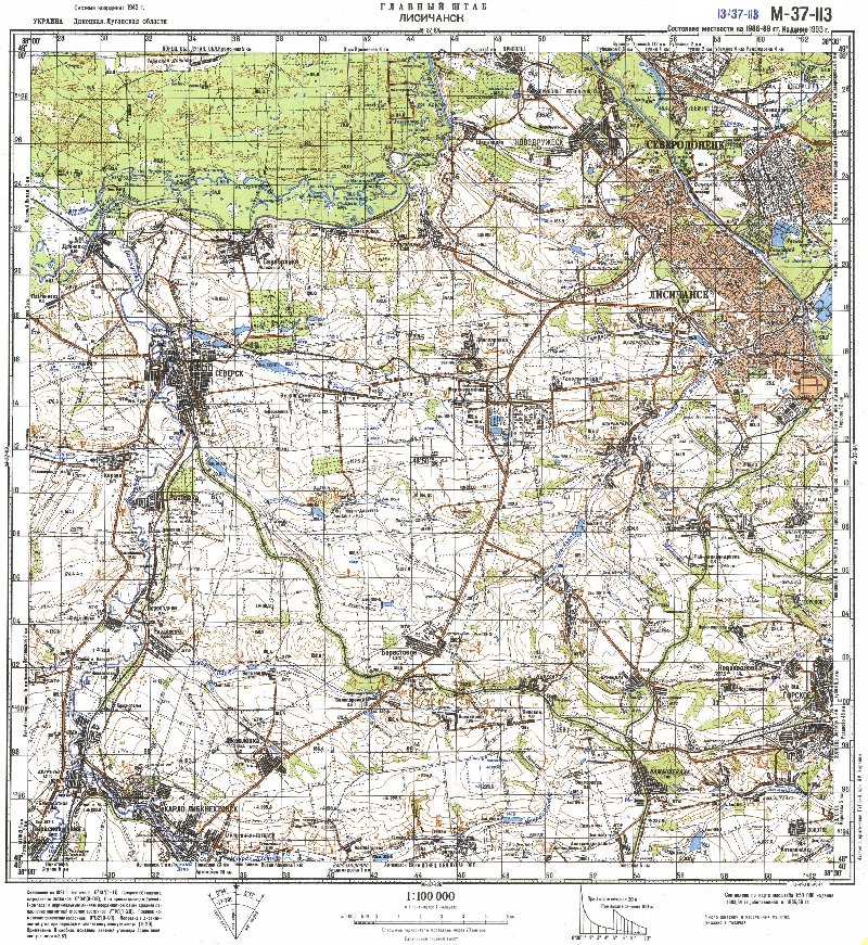 1:100000 (километровка Генерельного Штаба СССР, в одном сантиметре 1 километр)